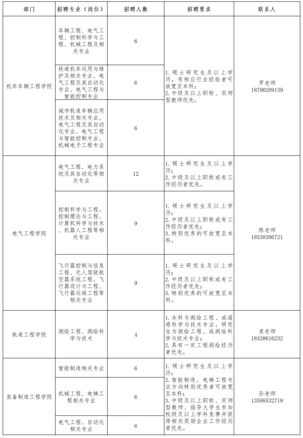 学校现有专任教师近500名,副高级以上教师80余人,设有轨道工程学院、机车车辆工程学院、运输管理学院、信息工程学院、电气工程学院、装备制造工程学院、马克思主义学院、基础教学部、体育教学部、中专部等七院三部。现已形成以城市轨道交通运营管理、城市轨道交通车辆技术、城市轨道交通工程技术、铁道通信与信息化技术、铁道供电技术五个主干特色专业为主,空中乘务、大数据技术、物联网应用技术、电子商务等专业协调发展的专业格局。根据学校未来发展需要和师资队伍建设规划,现面向社会公开招聘专任教师岗、辅导员岗。